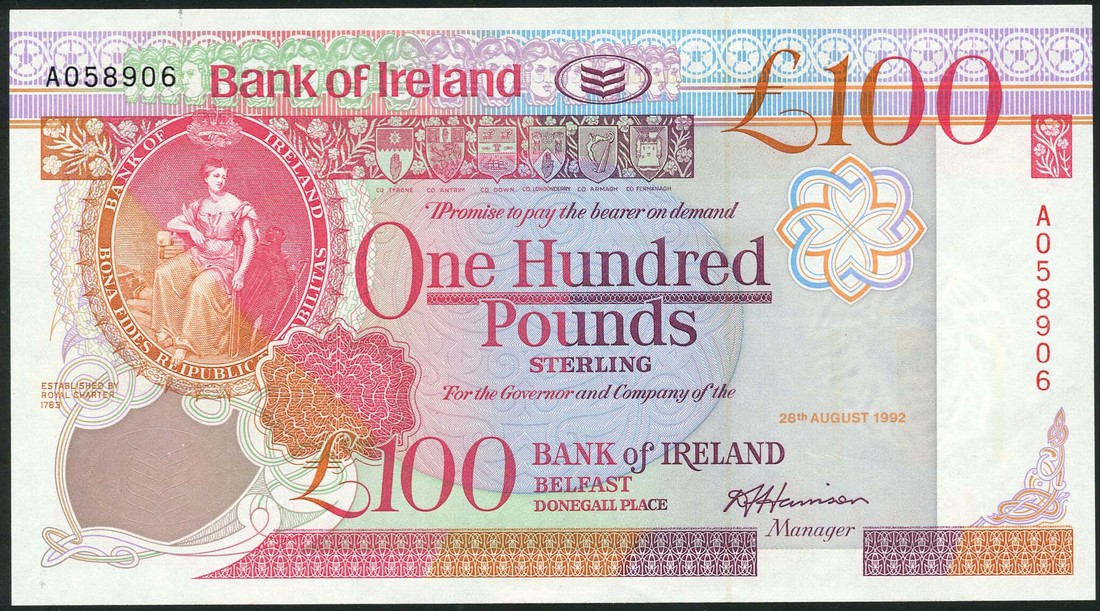 (x) Bank of Ireland, £100, 28 August 1992, serial number A058906, red and orange on multicolour underprint, Hibernia at top left, coats of arms at top centre, value at centre top right and low left