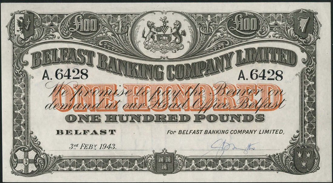 Belfast Banking Company, £100, 3 February 1943, serial number A.6428, black and white with value in brown underprint at centre, arms top centre and in borders, manuscript signature low right, reverse pale pink-red central panel with bank title and value