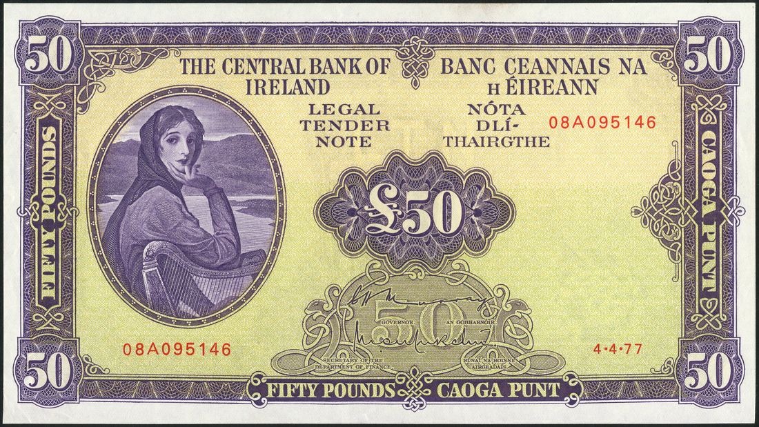 Central Bank of Ireland, £50, 4 April 1977, red serial number 08A 095146, violet, pale green and pale yellow, Lady Lavery at left, value at centre and at each corner, signatures of Murray and O'Murchulow centre, reverse violet and pale green, head representing the River Shannon and value at centre