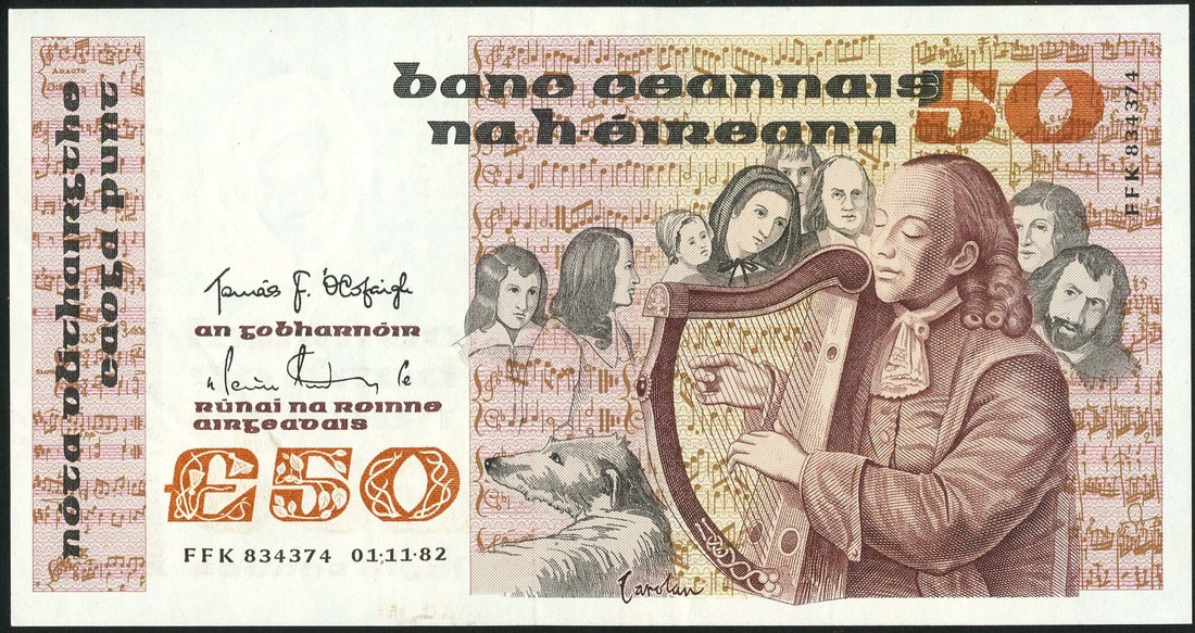Central Bank of Ireland, £50, 1 November 1982, serial number FFK 8343734, purple and multicoloured, Turlough O'Carolan at right, signatures of O'Cofaigh and Doyle, reverse brown and lilac, carvings from Saint Michan's Church