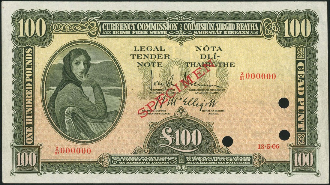 (†) Currency Commission, Irish Free State, specimen £100, 13.5.06 (1928), red serial number Z/01 000000, olive green on red, yellow and green underprint, Lady Lavery at left, value at low centre and each corner, Brennan and McElligott signatures, reverse olive green, River Erne mask at centre, value at left and right, red SPECIMEN overprint and three cancellation holes