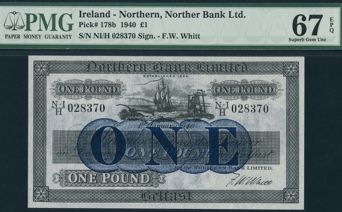 Northern Bank Limited, £1, 1 January 1940, serial number N-I/H 028370, dark grey, value in blue tablet at centre, vignette of sailing ship, plough and man operating loom at top centre, White signature, reverse, value guilloche patterns