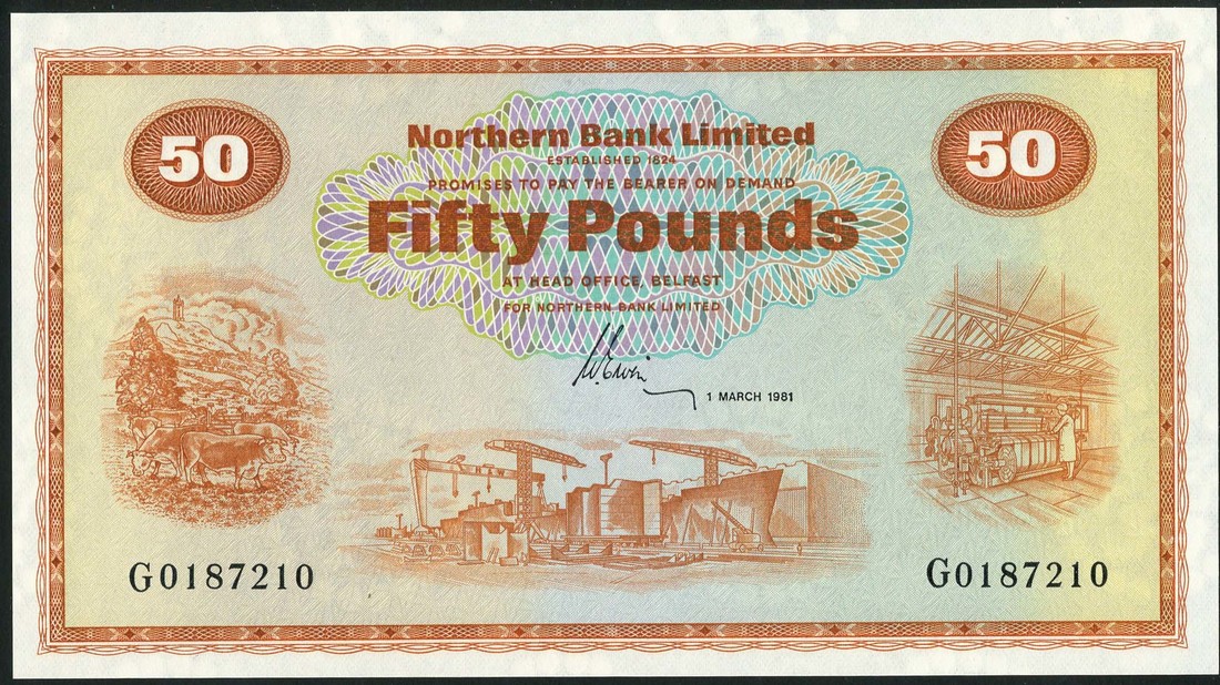 Northern Bank Limited, £50, 1 March 1981, serial number G 0187210, orange-brown and multicoloured, various allegorical scenes at low centre and at left and right, signature of Wilson Erwin at centre, reverse pink-brown, arms and value