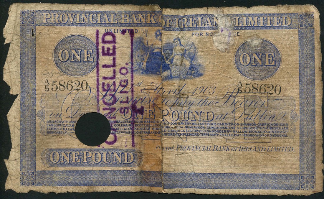 Provincial Bank of Ireland Limited, £1, 1 April 1903, serial number A/5 58620, blue and white, Britannia and Hibernia top centre, head of Queen Victoria top left, manuscript signature low right, bank branches at left and right, purple CANCELLED handstamp, hole punch