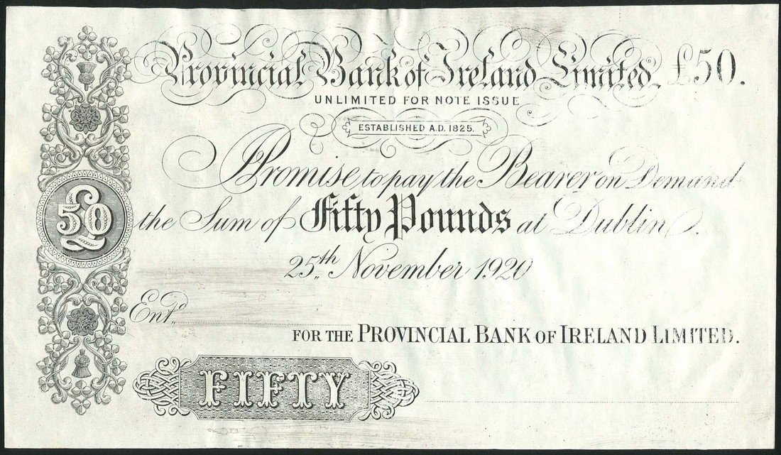 Provincial Bank of Ireland, proof £50, 25 November 1920, black and white, value and vertical floral panel at left