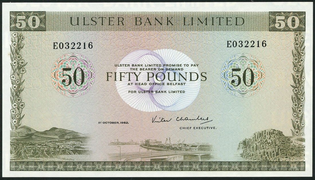 Ulster Bank Limited, £50, 1 October 1982, serial number E 032216, green and multicoloured, allegorical symbols in field, signature of Victor Chambers low right, reverse green, orange and pale blue, arms and value