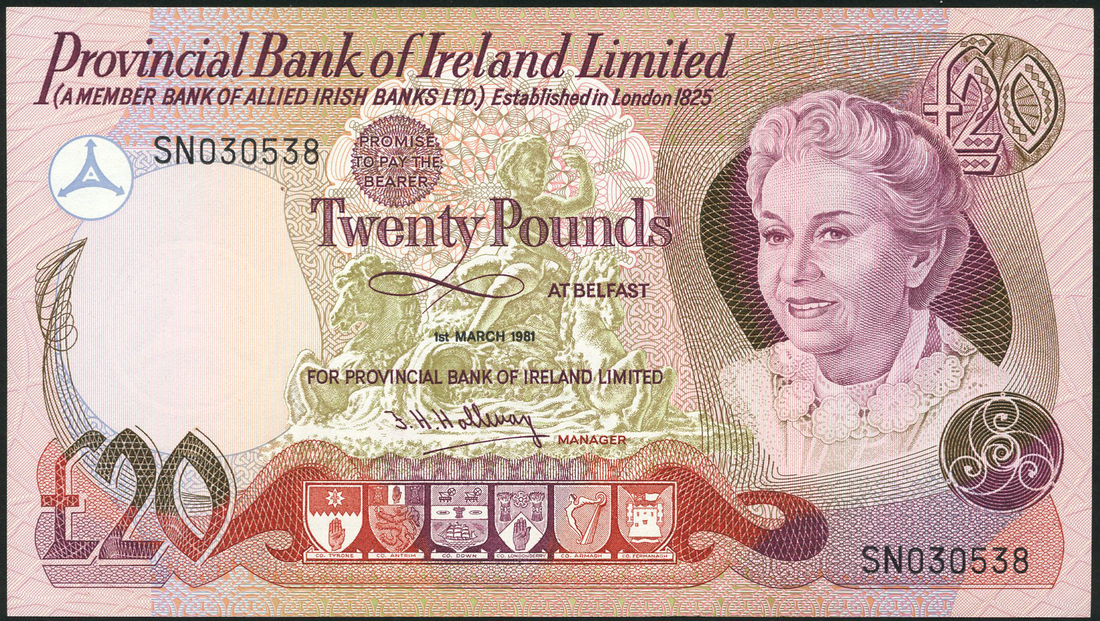 Provincial Bank of Ireland Limited, £20, 1 March 1981, serial number SN 030538, purple, also Central Bank of Ireland £5 (3), 1981,1983 (2), £10 (2), 1990, £50, 1982