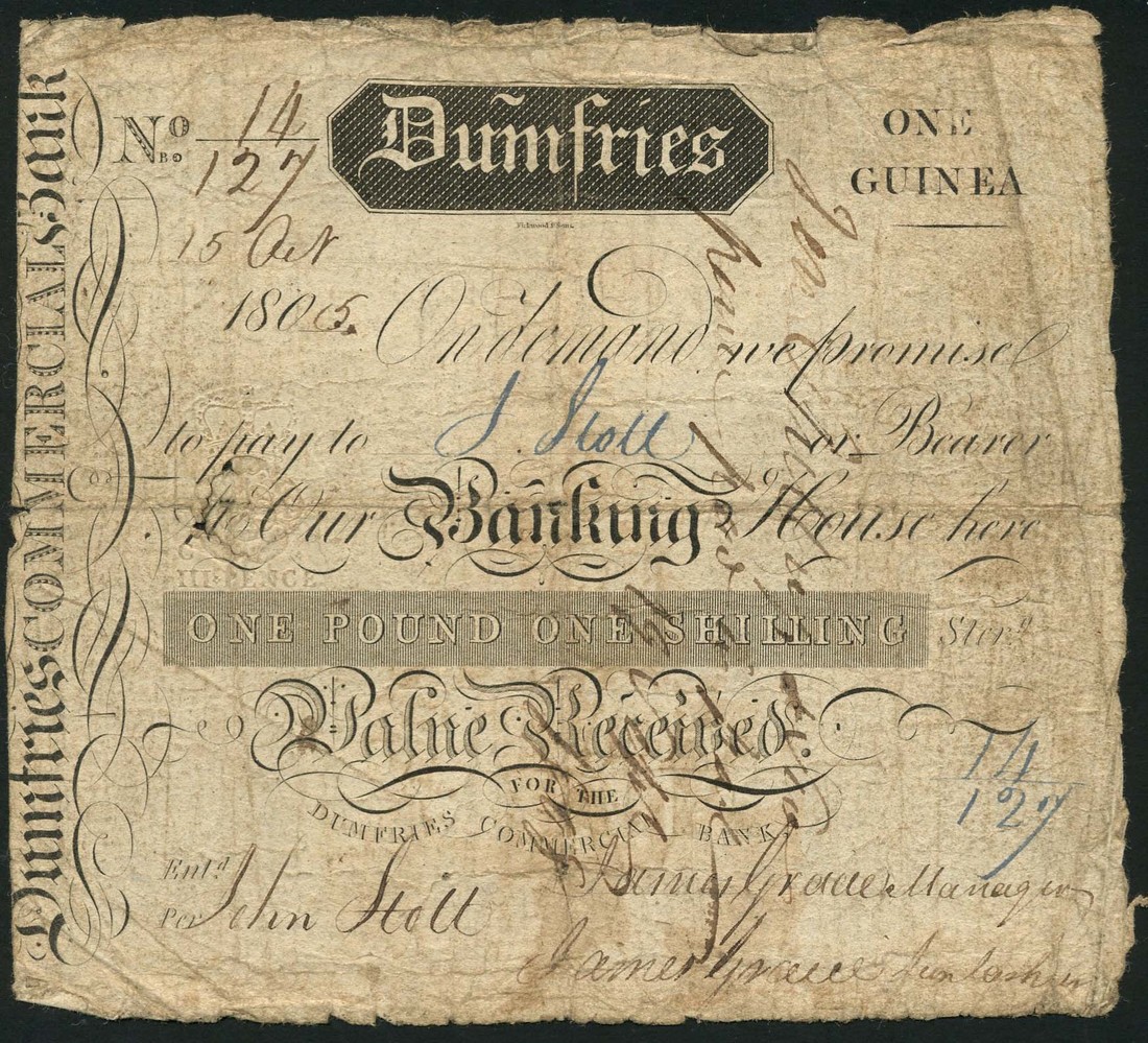 Dumfries Commercial Bank, One guinea, 15 October 1805, serial number 14/127, black, bank title in vertical format at left, value top right and at centre, DUMFRIES in black tablet top centre, manuscript signatures