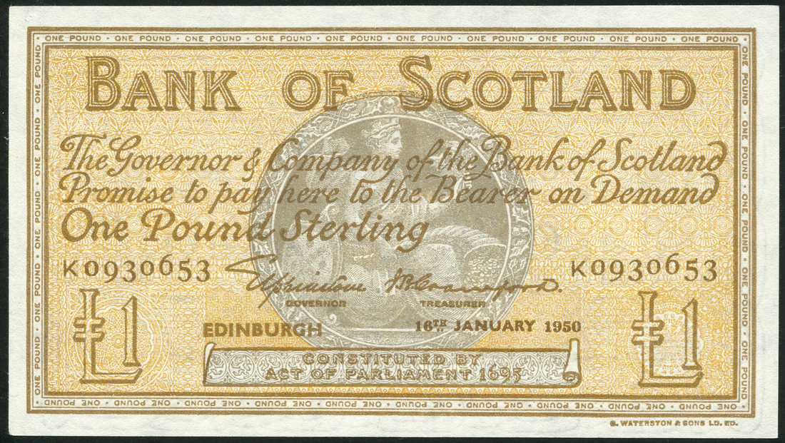 (x) Bank of Scotland, £1 (2), 6 February 1945, 16 January 1950, serial numbers B0799581 and K0930653, also £1 (4), 1965, 1966, 1967 (2), serial numbers A/N0271011, A/Q0357765, A/X 0419802 and A/Z0821701, Bilsland/Watson (1), Polwarth/Letham (3) signature, brown and light orange, bank title top centre, grey medallion at centre, value in border around, Elphinstone/Crawford signature, reverse, bank arms on lined background,