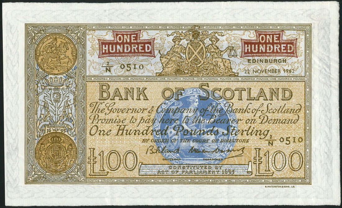 Bank of Scotland, £100, 22 November 1962, serial number 2/N 0510, brown, tan, red and blue, arms at top centre and low left, value at each corner, blue medallion at centre