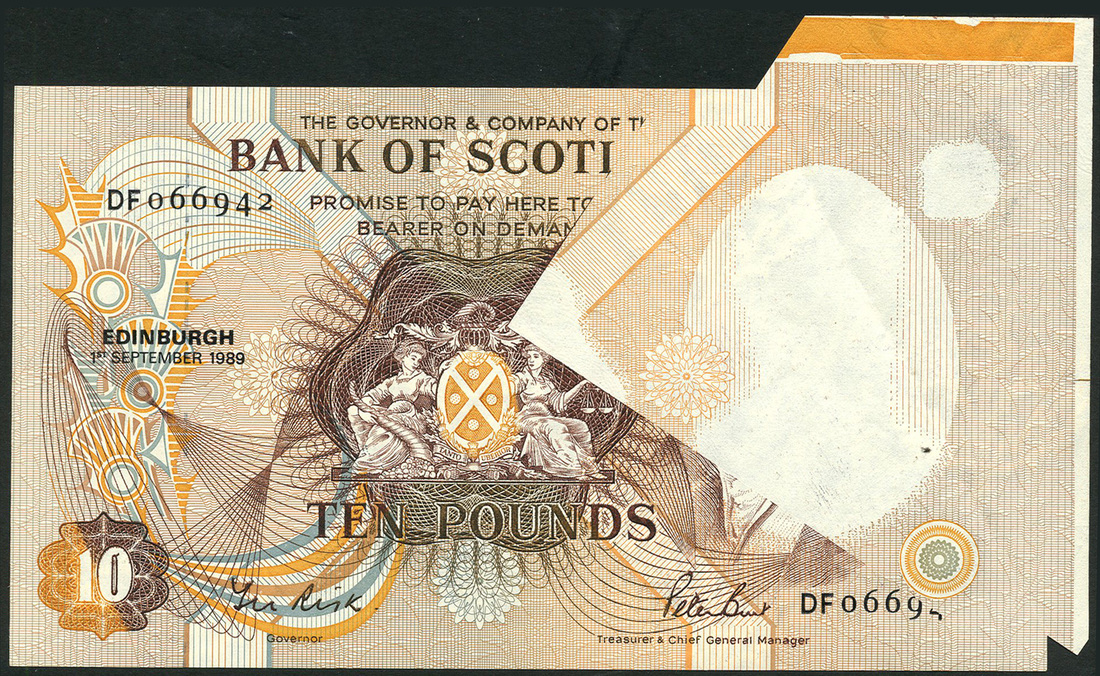ERROR: Bank of Scotland, £10, 1 September 1989, serial number DF066942, brown, arms at centre, portrait of Sir Walter Scott at left, T.N Rick and P. Burt signatures, part of Sir Walter Scott's face is printed on reverse
