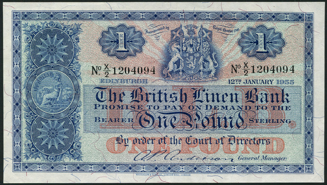 (x) British Linen Bank, a group comprising £1 (4), 12 January 1955, prefix X/2, 31 March 1962, prefix U/3, 13 June 1967, prefix G/4, 29 February 1968, prefix U/4, also £5 (5), 7 January 1953, prefix 1953, 2 January 1961, prefix Z/11, 20 October 1962, prefix E/12, 17 July 1964, prefix H/12 and 23 April 1968, prefix L/12