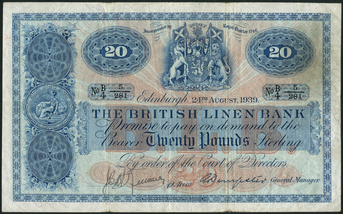 British Linen Bank, £20, 24 August 1939, serial number B/4 5/281, blue, red sunburst design at centre, arms top centre flanked by value, Pallas left centre, manuscript signature low left, printed signature of Dempster low right, reverse blue, Pallas at centre