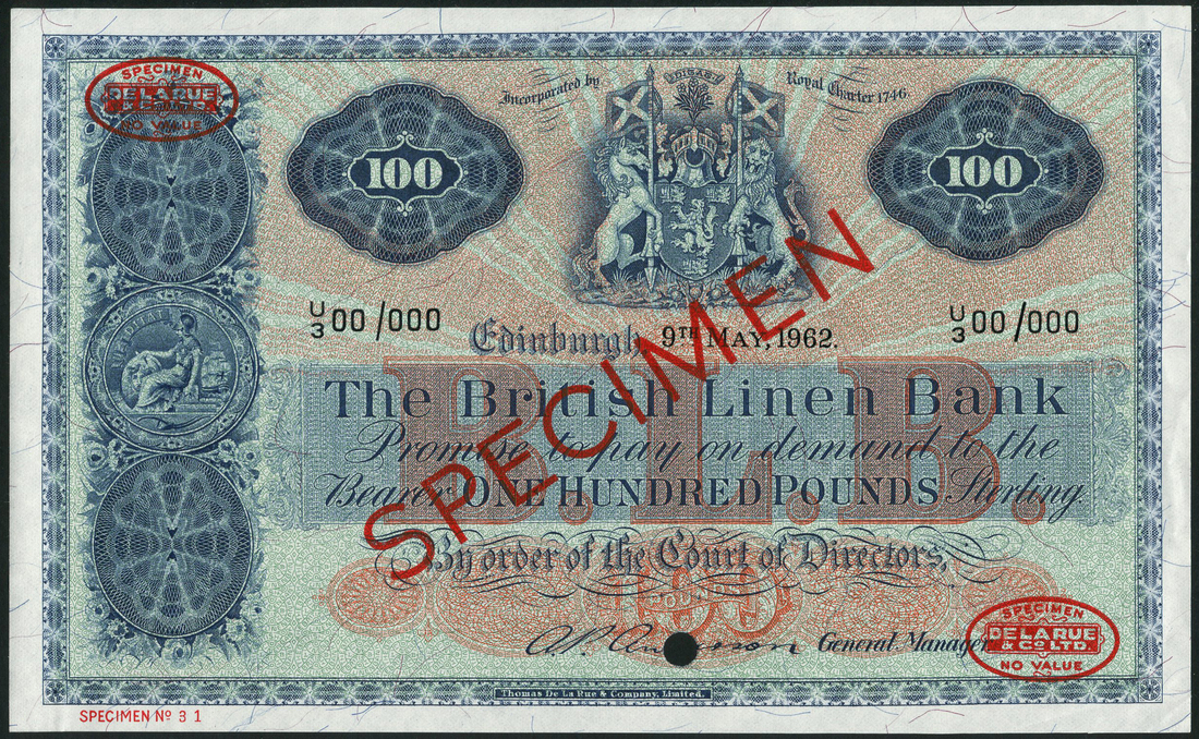 (†) British Linen Bank, specimen £100, 9 May 1962, serial number U/3 00/000, Anderson signature, blue on red sunburst underprint, royal arms at top centre, value in ornate guilloches on either side, ornate panel with bank arms at left, reverse blue, bank arms in pattern at centre, value at left and right, overprinted SPECIMEN diagonally in red with two De La Rue oval specimen seals on obverse and reverse, one punch hole