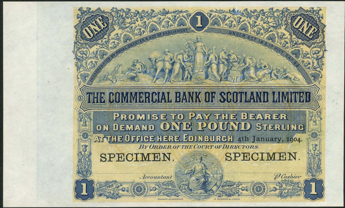 (†) Commercial Bank of Scotland Limited, specimen £1 (2), 3 January 1898 and 4 January 1904, the first serial number run 15/U 1/1 to 15/U 200/500, printed signature of Accountant, perforated SPECIMEN BW & Co LONDON; the second no serial numbers, no signatures, overprinted SPECIMEN twice horizontally on obverse, both blue on buff underprint, figures sculptured on the pediment of the bank's head office building at upper centre, reverse green, head office building set in ornate patterned oval