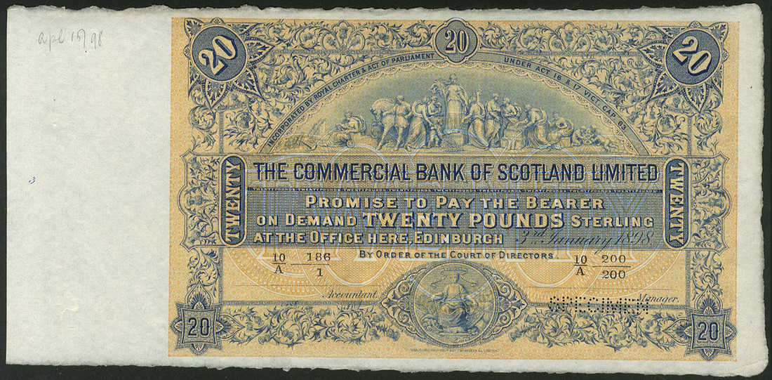 (†) Commercial Bank of Scotland Limited, printer's archival specimen £20, 3 January 1898, serial number run 10/A 186/1 to 10/A 200/200, no signatures, figures sculptured on the pediment of the bank's head office building at upper centre, reverse brown, head office building set in ornate patterned oval, value in guilloches at left and right, perforated SPECIMEN