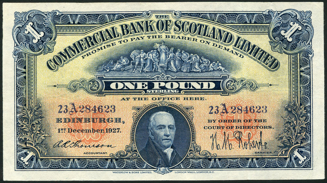 (x) Commercial Bank of Scotland Limited, £1, 1 December 1927, serial number 23A 284623, dark blue on pale pink and yellow underprint, portrait Lord Pitcairn at low centre, bank title top centre, ornate border with value in each corner, Thomson/Roberts signature, reverse, illustration of bank building within guilloche pattern