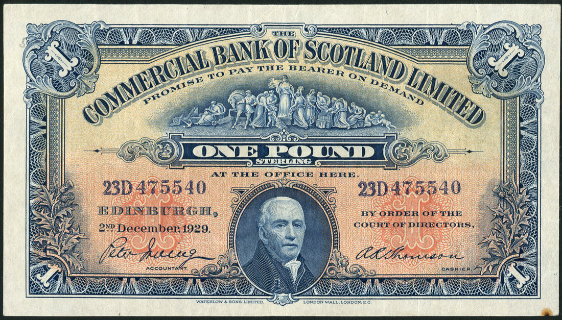 Commercial Bank of Scotland Limited, £1, 2 December 1929, serial number 23D 475540, blue on yellow and red underprint, portrait Lord Pitcairn flanked by value in ornate panels at low centre, bank title top centre, value in dark blue tablet at centre, bank's head office within elaborate panel