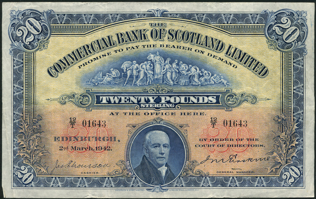 Commercial Bank of Scotland Limited, a group comprising £20, 1942, £5, 1943, blue, Thomson and Erskine signatures, £5 (2), 1953,1954, purple, £1 (6), 1944 (2), 1952 (2), 1957,1958