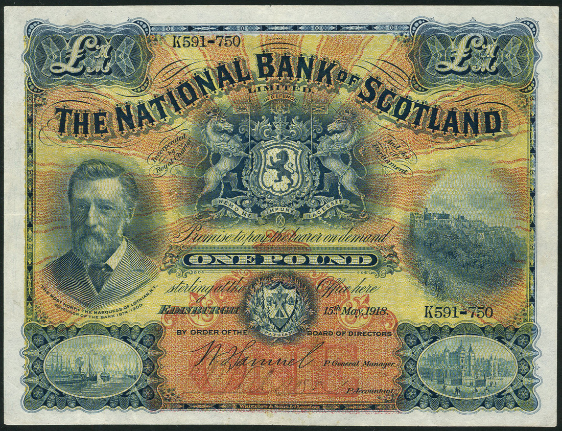 National Bank of Scotland, £1, 15 May 1918, serial number K591-750, dark blue on red and yellow sunburst underprint, portrait Marquess of Lothian at left, bank title top centre, with arms below, value top left and right and at low centre, view of Edinburgh Castle at right, Samuel signature, reverse, view of Edinburgh within ornate blue panel