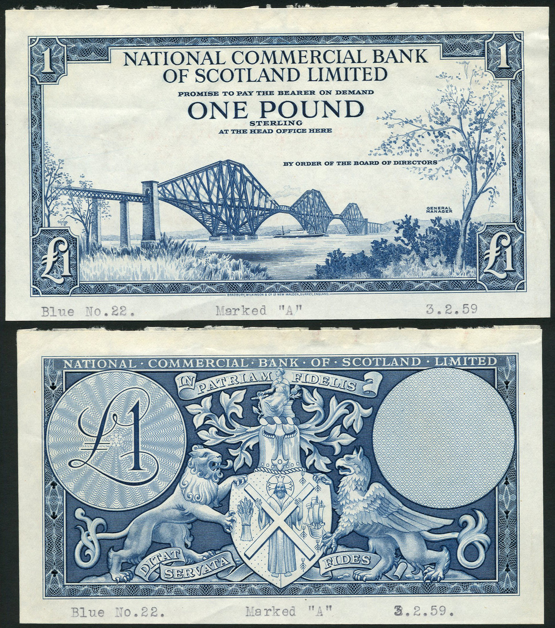 (†) National Commercial Bank of Scotland Limited, printer's obverse and reverse uniface die proofs for a £1, ND (1959), 'Blue No. 22' and typed date '3. 2. 59' in lower margin, Forth Rail Bridge at left centre, value in each corner, reverse coat of arms; also printer's obverse and reverse uniface die proof £1, ND (1961), 'Grey Green No.17' and typed date '8. 9. 61' in lower margin, Forth Rail Bridge at left centre, value in each corner, reverse coat of arms