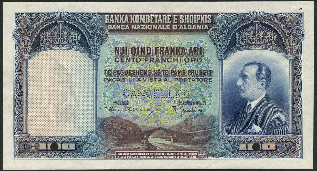 (x) Banca Nazionale d'Albania, colour trial 100 franka, ND (c.1926), no serial number, blue, green and purple, King Zog I at right, Gomsiqe bridge in Puka at centre, reverse green and purple, the Drin river near Shkoder valley at centre,