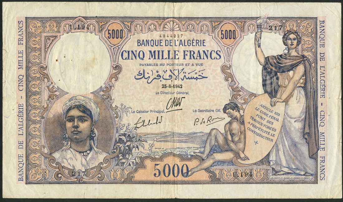 Banque de l'Algerie, 5000 francs, 25 August 1942, serial number u194 4844217, blue and multicoloured, Algerian woman at left, woman and boy at right, reverse women with jugs