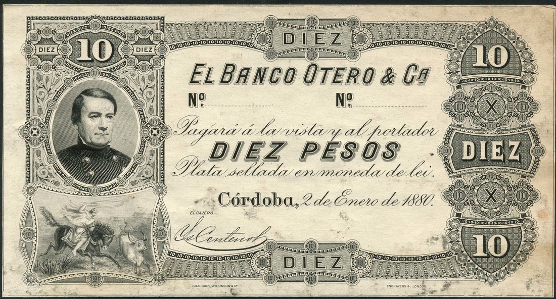 (†) El Banco Otero & Cia., Argentina, specimen uniface proof 10 Pesos on card, 2 January 1880, black and white, signature of El Cajero, portrait of General Jose Maria Paz y Haedo at left, man on horseback lassoing a bull at lower left; also specimen uniface progressive uniface proof 20 Pesos on card, 2 January 1880, black and white, value in ornate guilloches in all four corners, missing portrait at left and vignette at right
