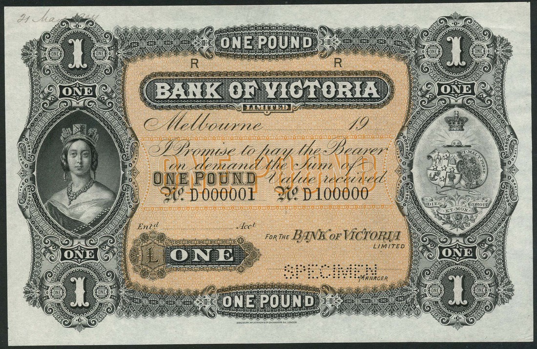 (†) Bank of Victoria, Australia, printer's archival specimen £1, Melbourne, 19-, serial number run D 000001 to D 100000, black, and orange, portrait of Queen Victoria in oval at left, arms in oval at right, value in guilloches in each corner, reverse orange and brown, three medallic heads of Queen Victoria, value at left and right and in each corner, perforated SPECIMEN