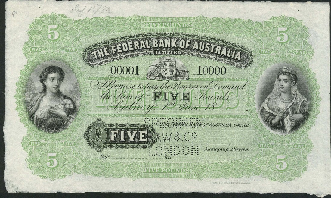 (†) Federal Bank of Australia, printer's archival specimen £5, 1 June 18-, serial number run 00001 to 10000, black and light green, woman with lamb at left, woman with turreted coronet at right, reverse blue and light green, value at centre and in guilloches at left and right, perforated SPECIMEN BW & Co LONDON