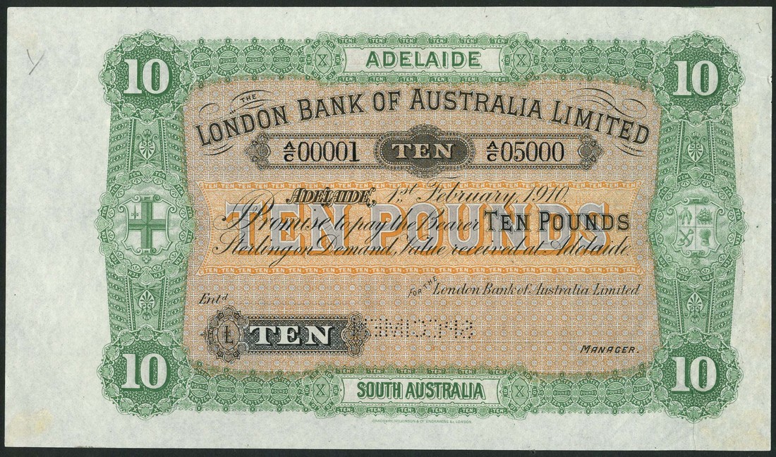 (†) London Bank of Australia Limited, printer's archival specimen £10, Adelaide, 1 February 1910, serial number run A/C 00001 to A/C 05000, green on orange and grey underprint, arms at left and right, value in centre panel, reverse sepia-grey and orange, value in ornate guilloche at centre and in each corner, perforated SPECIMEN
