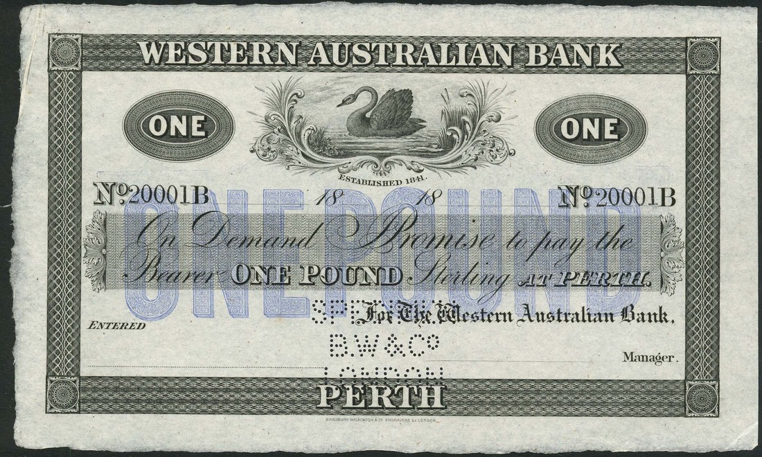 (†) Western Australian Bank, specimen, £1, Perth, 18-, serial number 20001B, black and white, value in pale blue, vignette of black swan at upper centre, value on either side, reverse pale blue, value in ornate guilloche, perforated SPECIMEN BW&Co LONDON