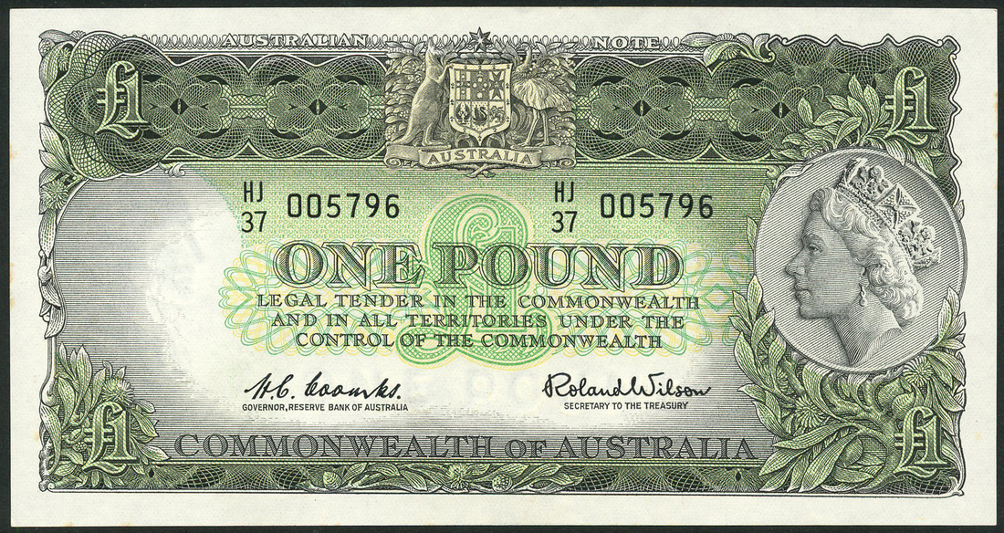 Commonwealth of Australia, Reserve Bank, £1 (2), ND (1961-66), serial number HJ/37 005796 and HJ/65 743165, black on green underprint, arms at top centre, Elizabeth II at right, value at centre and each corner