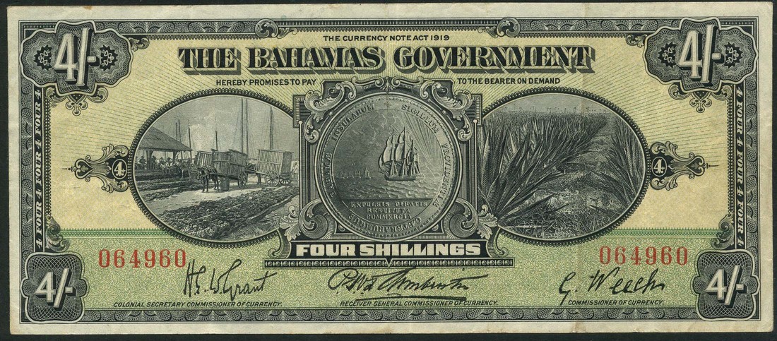 Bahamas Government issue, 4 shillings, ND (1919), red serial number 064960, black, green and pale orange, ship seal at centre, local scenes at left and right, value at each corner, signatures of Grant, Ambrister, Weech, reverse green, value