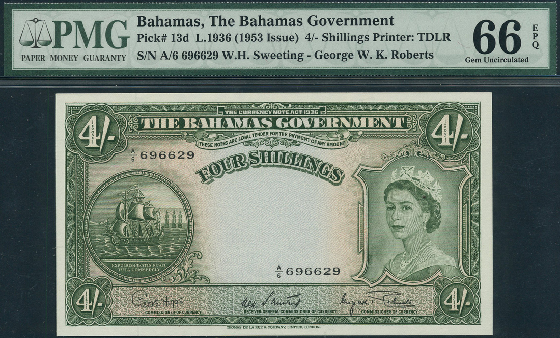 Bahamas Government, 4 shillings, ND (1936), serial number A/6 696629, green, portrait Queen Elizabeth II at right, sailing ship seal at left, value in each corner and at top centre, reverse, arms and value within ornate panel