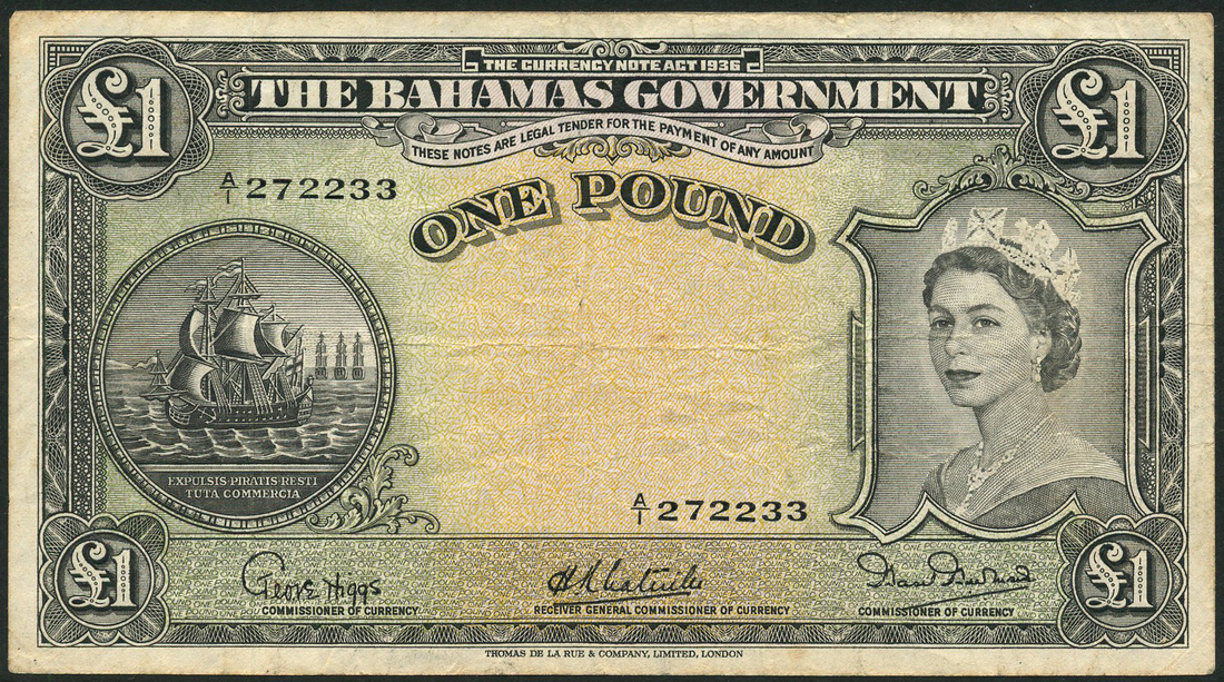(x) Bahamas Government, 4 shillings, ND (1954), serial number A/3 674011, green and light pink, £1, ND (1953), serial number A/1 272233, dark grey on pale yellow and green, both feature portrait Queen Elizabeth II in ornate frame at right, value in each corner, bank title top centre