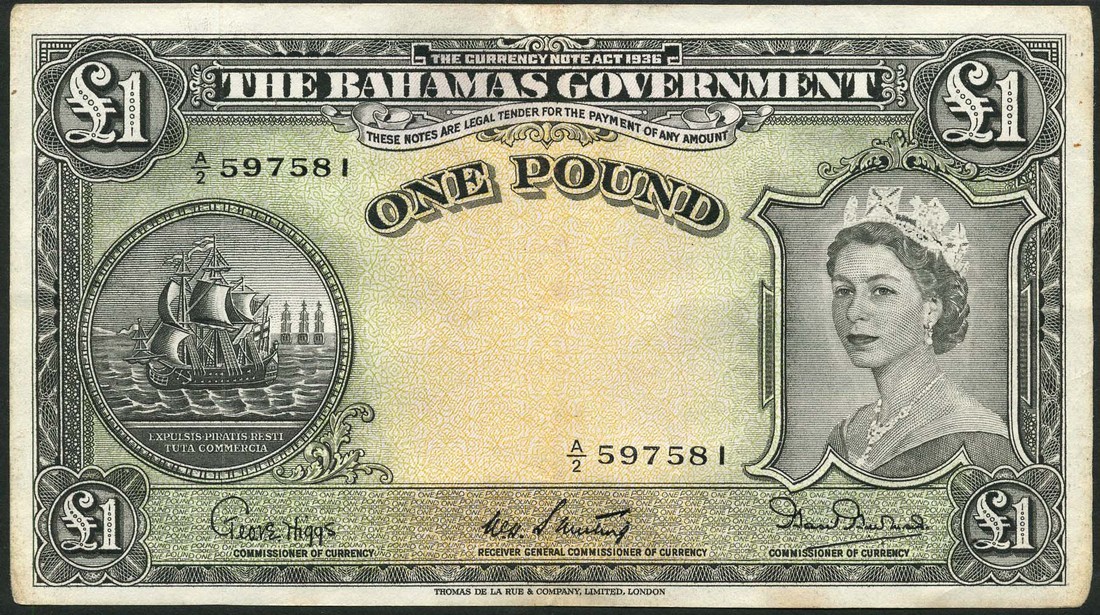 Bahamas Government, £1, ND (1953), serial number A/2 597581, black on multicolour underprint, Elizabeth II at right, sailing ship at left, value at each corner, together with $1/2 (3), ND (1965), purple, with Elizabeth II at left, and 4/-, 1963, green, Elizabeth II at right, ship at left