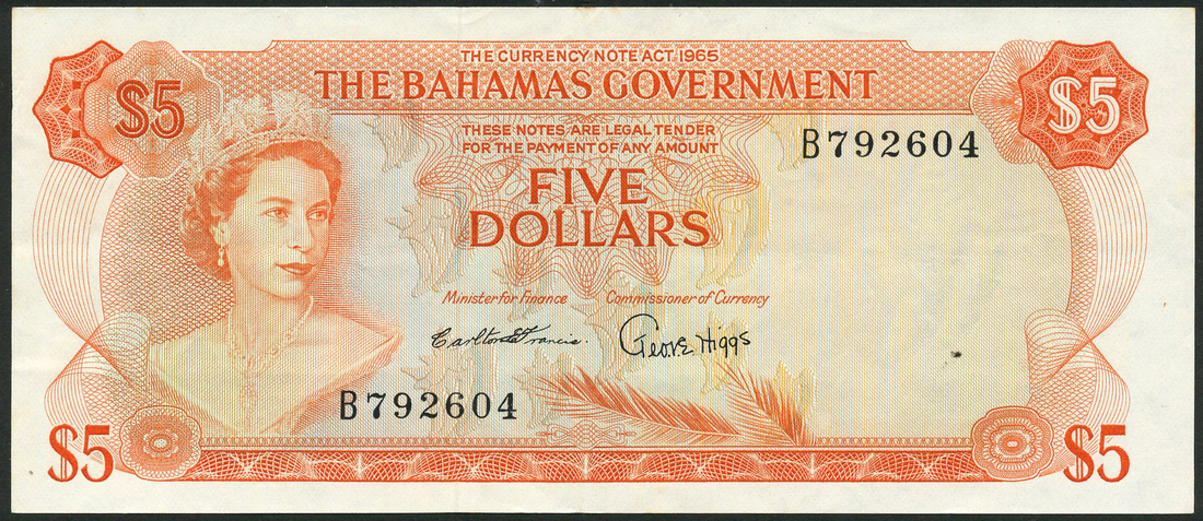 Bahamas Government, $1 (3), ND (1965), serial numbers A662963-65, $1 (3), $3 (2), ND (1965), serial numbers A252852 and A012891, red on multicolour underprint, Elizabeth II at left, value at each corner, and $5, ND (1965), serial number B792604, orange on multicolour underprint, Elizabeth II at left, value at each corner
