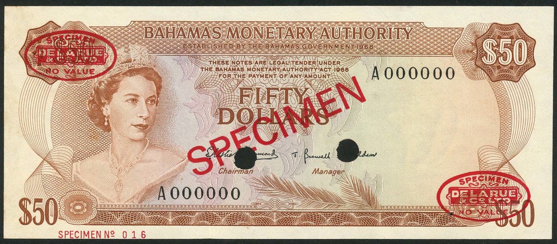 Bahamas Monetary Authority, specimen $50, ND (1968), serial number A000000, brown on multicolour underprint, Elizabeth II at left, value at each corner, two cancellation holes and red De La Rue ovals and SPECIMEN overprint, also $1/2 (4), ND (1968), serial numbers D094060-61 and D049202, purple on multicolour underprint, Elizabeth II at left, value at each corner, also a specimen of the same note, prefix C, with red SPECIMEN overprint