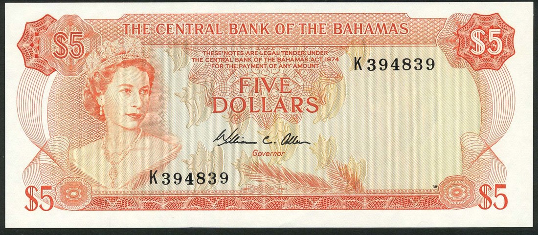 Central Bank of the Bahamas, $5, ND (1974), serial number K394839, orange on multicolour underprint, Elizabeth II at left, value at each corner