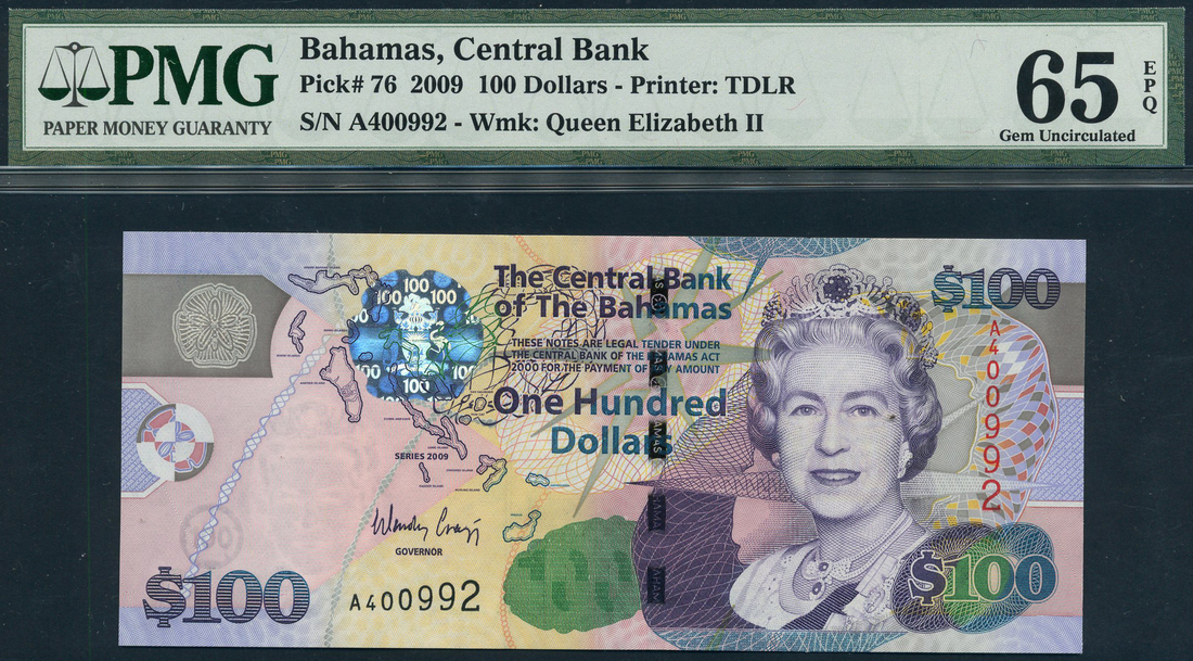 Central Bank of the Bahamas, $100, ND (2009), serial number A400992, purple and multicolour, portrait Queen Elizabeth II at right, map of islands top centre left, reverse, blue marlin at left, arms low centre, also $3 (2), serial numbers A000391 and A978305, red, beach scene at left, portrait Queen Elizabeth II centre right, reverse, boats at centre, arms at right