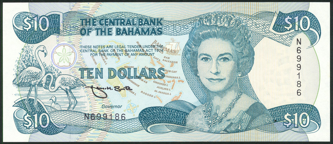 Central Bank of the Bahamas, $10, ND (1992), serial number N699186, turquoise on multicolour underprint, Elizabeth II at right, value at each corner