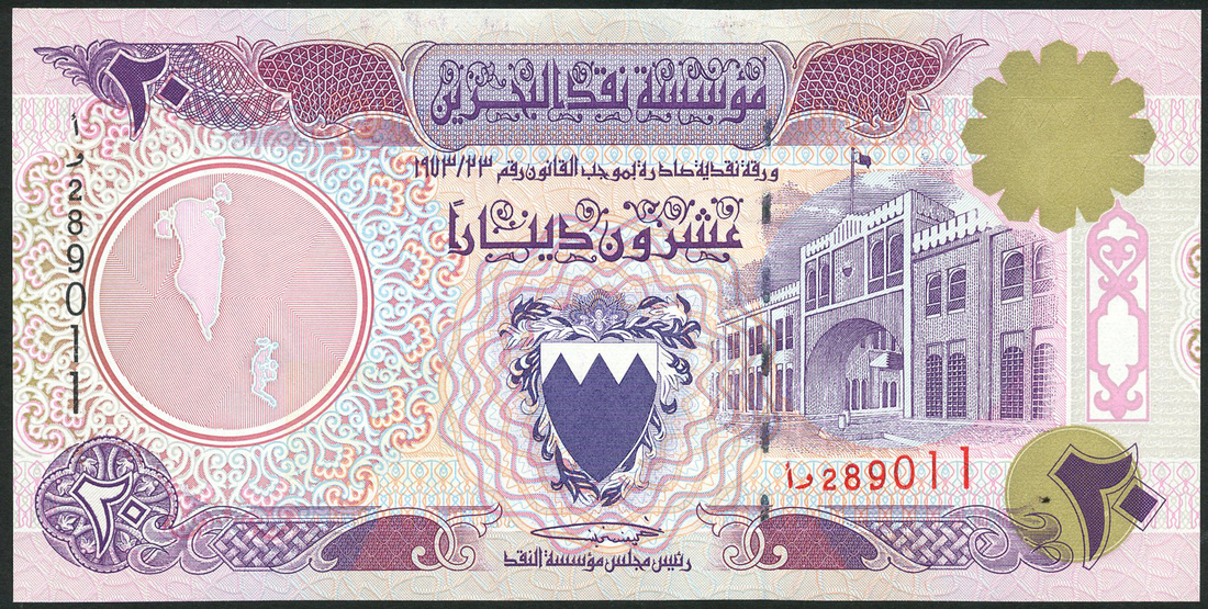 Bahrain Monetary Agency, 20 dinars, 1998, serial number 289011, mauve and multicolour, Bab al-Bahrain Gate at right, map at left, Ahmed Al-Fateh Islamic Centre at left, bank title top centre, value top left and right, centre and low right, also 5 and 10 dinars, 1998, serial numbers 554285 and 587920, blue and multicolour, Riffa Fortress at right, green and multicolour, ship at right, map at left, reverse, airport and aerial view of Kings Fahad Causeway respectively