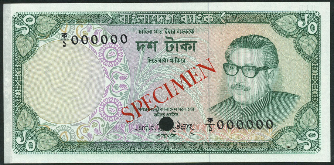 (†) Bangladesh Bank, specimen 5 Taka, ND (1972), serial number 0000000, green and multicoloured, Mujibur Rahman at left, specimen 5 Taka, ND (1973), serial number 000000, red and multicoloured, Mujibur Rahman at right, specimen 10 Taka, ND (1973), serial number 000000, green and multicoloured, Mujibur Rahman at right, all with overprinted SPECIMEN diagonally in red or black on obverse and reverse, all one punch hole