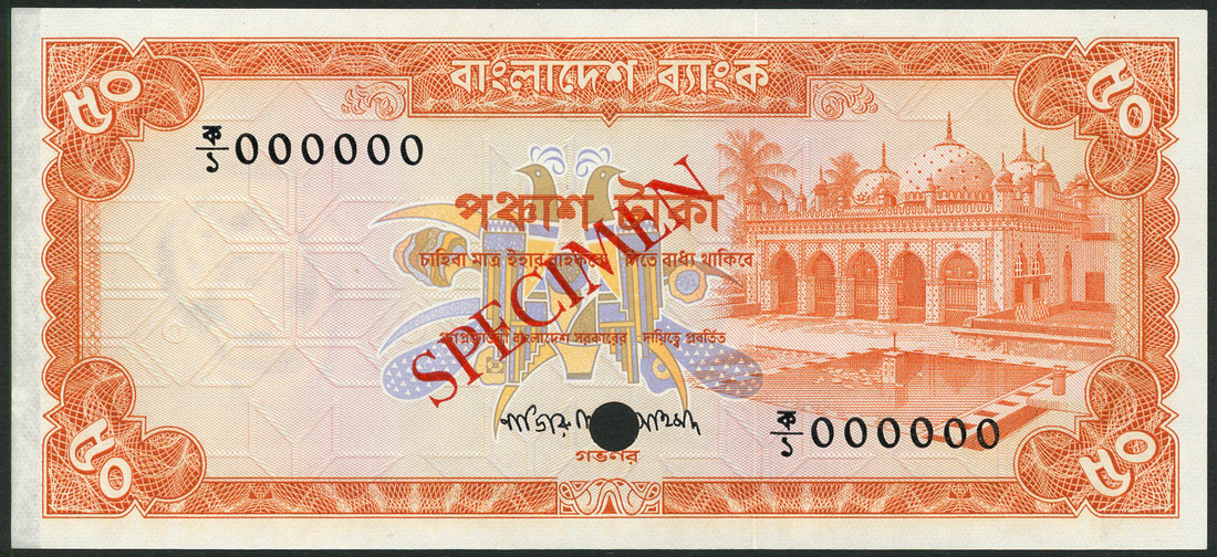 Bangladesh Bank, specimen 10 taka, ND (1976), zero serial numbers, lilac, the Tara Masjid Mosque at right, also specimen 50 taka, orange, design as previous note, both Naziruddin Ahmed signature