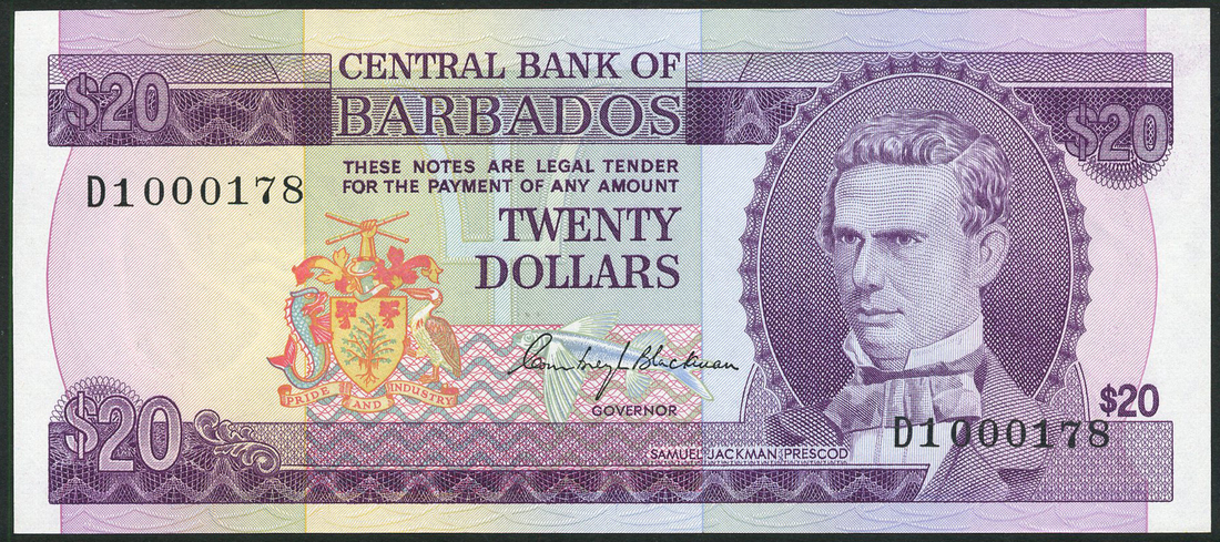 Central Bank of Barbados, $20, 1973, serial number D1 000178, purple, Samuel Jackman Prescod at right, also $10 (5), 1975, serial numbers C1 000241, 242, 244, 250 and 251, brown, Charles Duncan O’Neal at right, both with arms at left, value at corners