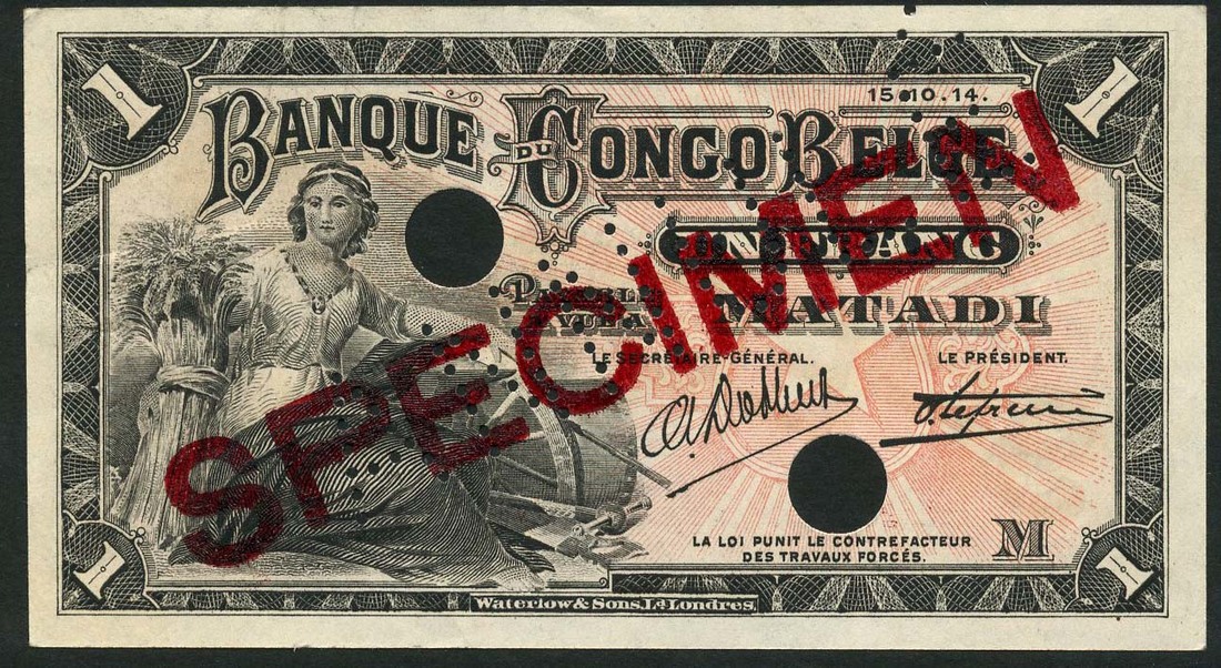 (x) Banque du Congo-Belge, specimen 1 franc, Matadi, 15 October 1914, black on pale pink-red, maiden seated at left with corn sheaf and wheel, value at right and at each corner, black MATADI in field at right, French text, signatures of Dothey and Lepreux, reverse Dutch text and MATADI at centre