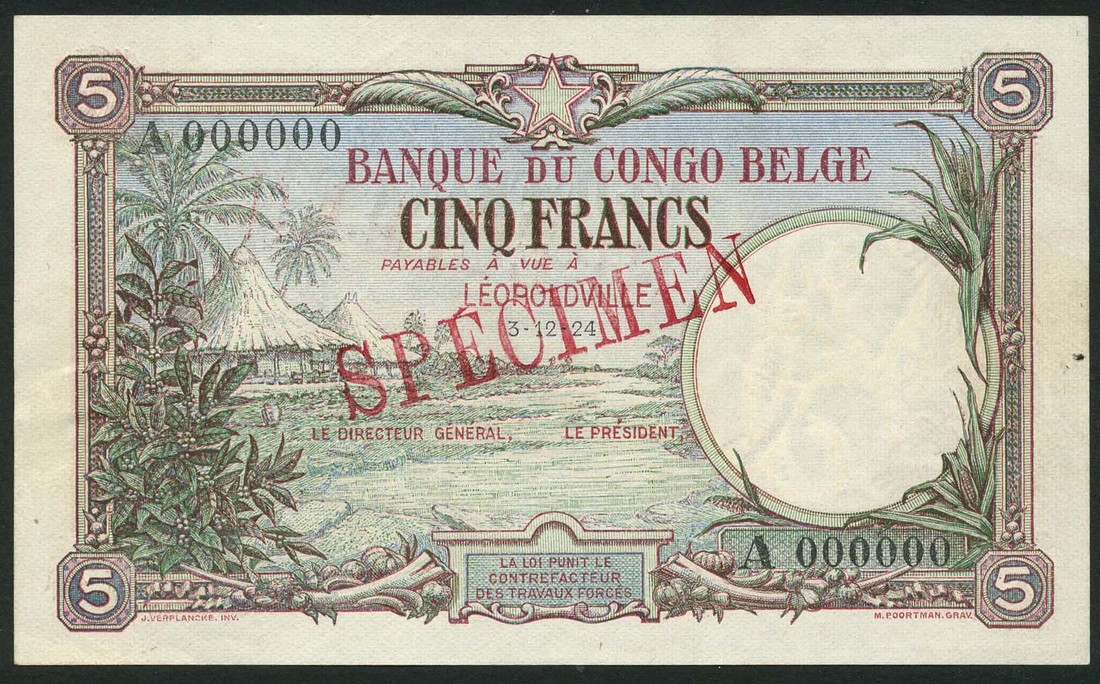 (x) Banque du Congo-Belge, specimen 5 francs, Leopoldville, 3 December 1924, serial number A 000000, pale blue and multicoloured, conical huts at left, red LEOPOLDVILLE in field at centre, french text, reverse blue and lilac, river steamer right centre, fronds at left and right, red LEOPOLDVILLE top centre