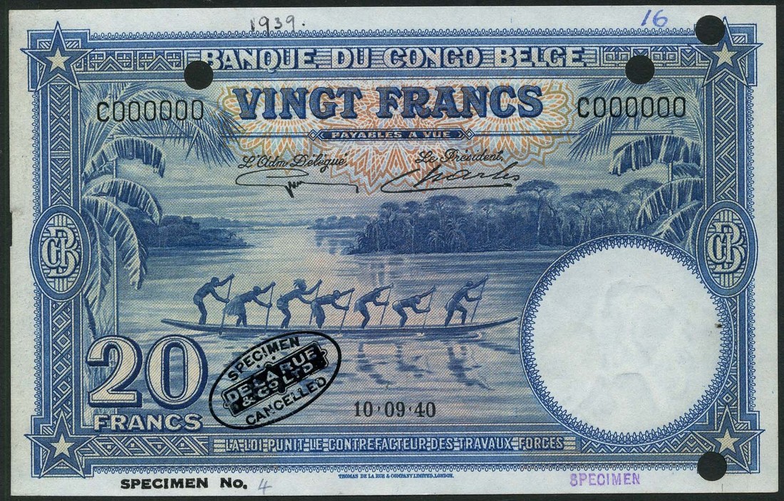 (†) Banque du Congo Belge, specimen 20 francs, 10 September 1940, serial number C000000, blue on multicolour underprint, longboat with seven oarsman at centre, reverse logging with elephants, black De La Rue ovals, perforated CANCELLED