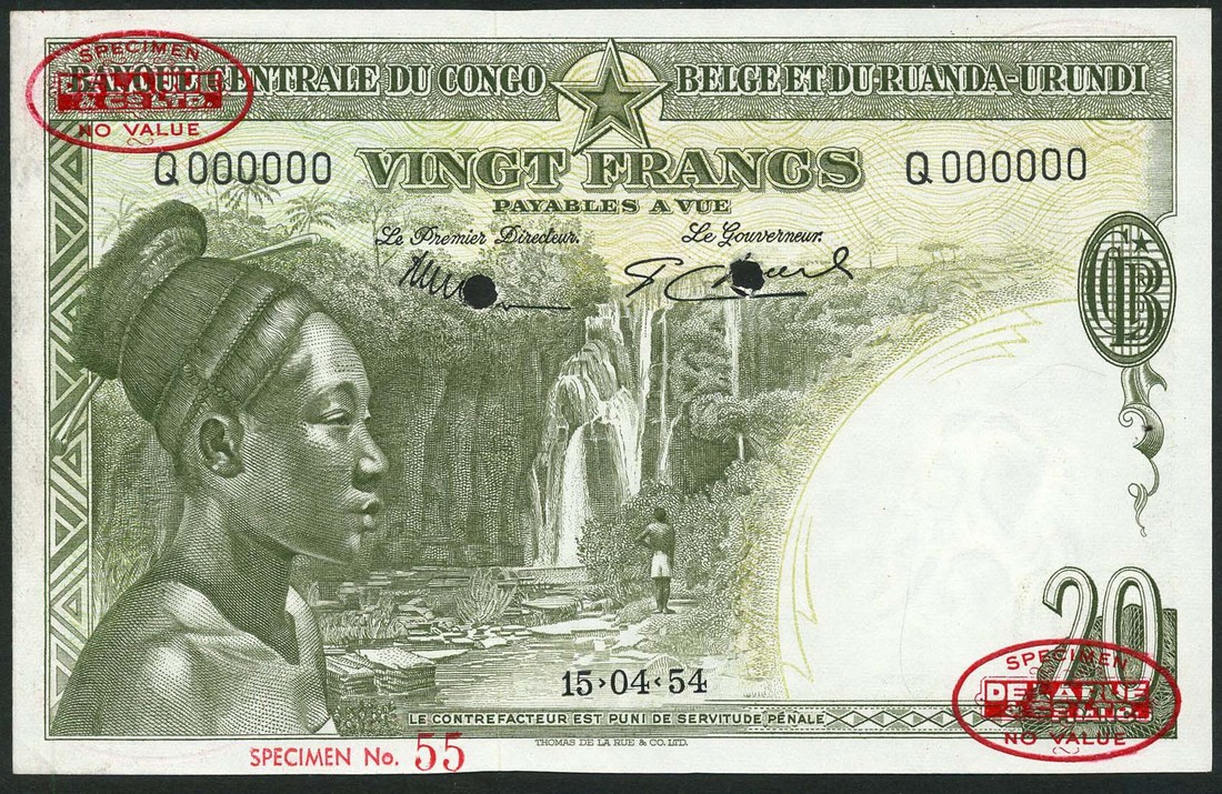 (†) Banque Centrale Du Congo Belge et du Ruanda-Urundi, 20 francs, 15 April 1954, serial number Q 000000, green print, Mangbetu women at right, waterfall in background, reverse green, with red Del La Rue seals, hole punched